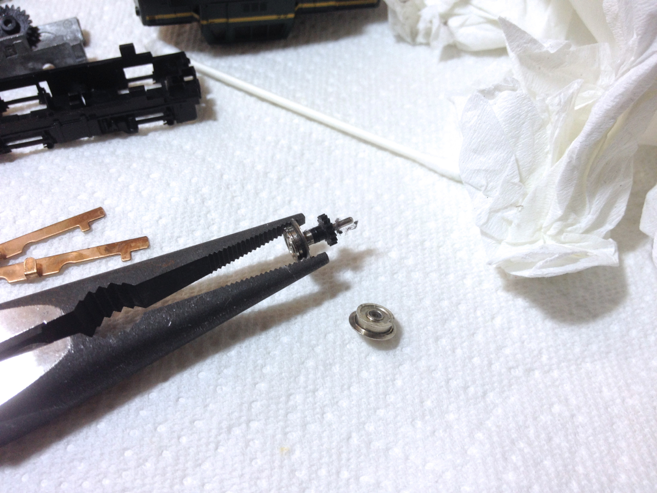 ゴムタイヤの欠けていた車輪踏面にはスパーク汚れが。しかしゴムタイヤ向けの軸なので溝があって拭いきれない…。最終的にはゴムタイヤを履かせたら無関係な汚れになるので、”程々” にしておきました。
