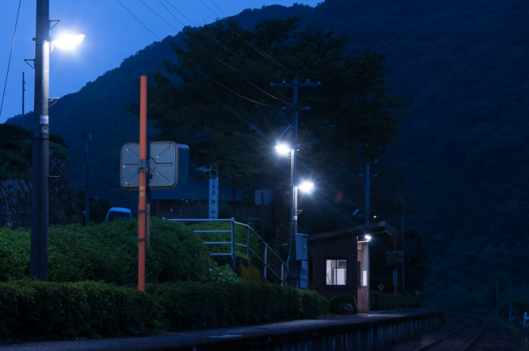 普通列車も遅れが発生していたために今日の撮影は打ち止めにして、今回の定宿にしている山口市内へ戻ることに。その道すがらなかなか良いローカル感のある駅があったので、立ち寄って駅待合の写真などを撮っていたところ踏切の警報音…。